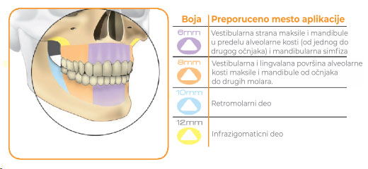 - Dupla deltoidna glava mini implanta koja omogućava razne vrste kačenja ligatura i federa